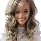 Długa syntetyczna peruka z dłuższą opadającą grzywką, bez stałego przedziałka.