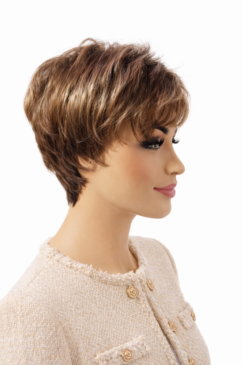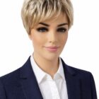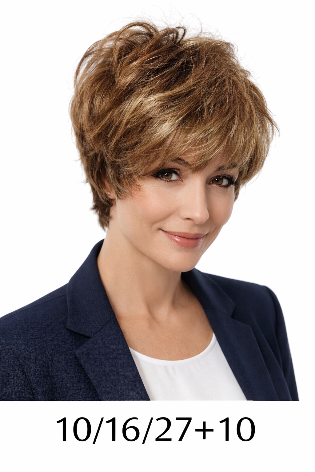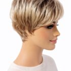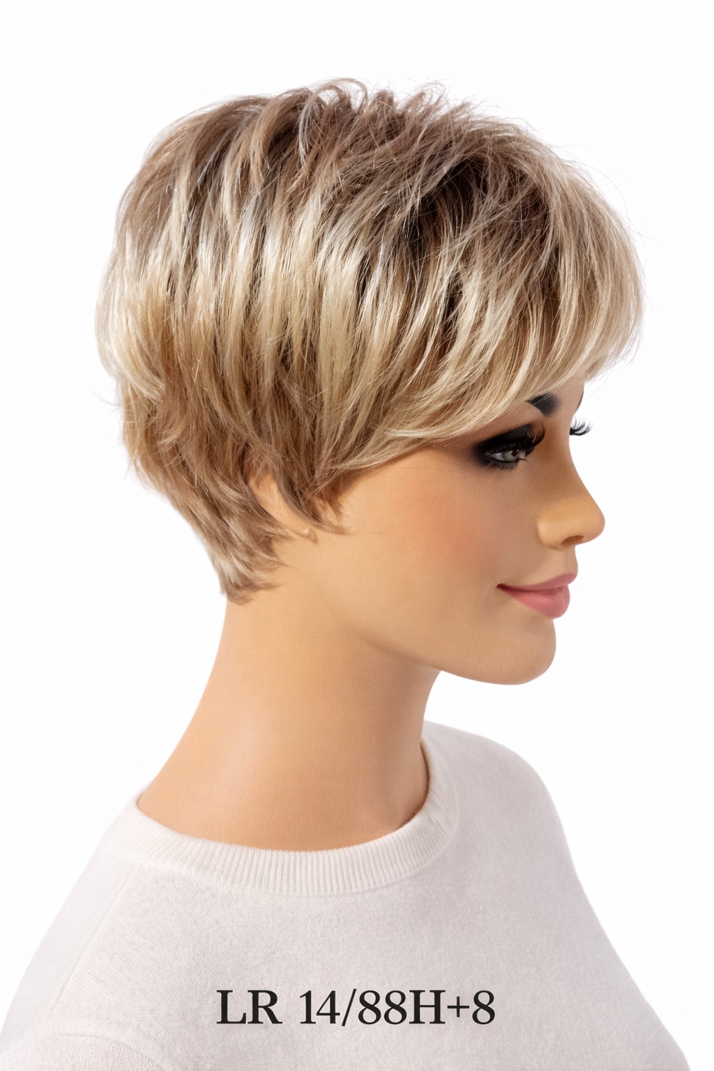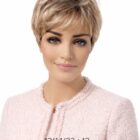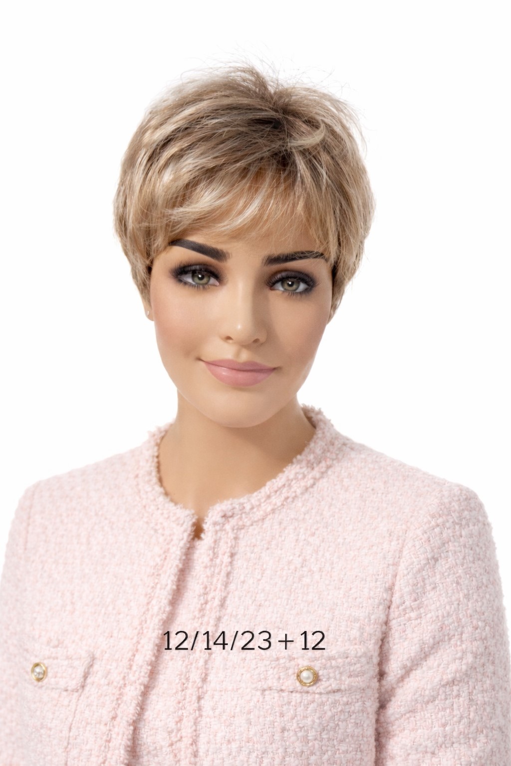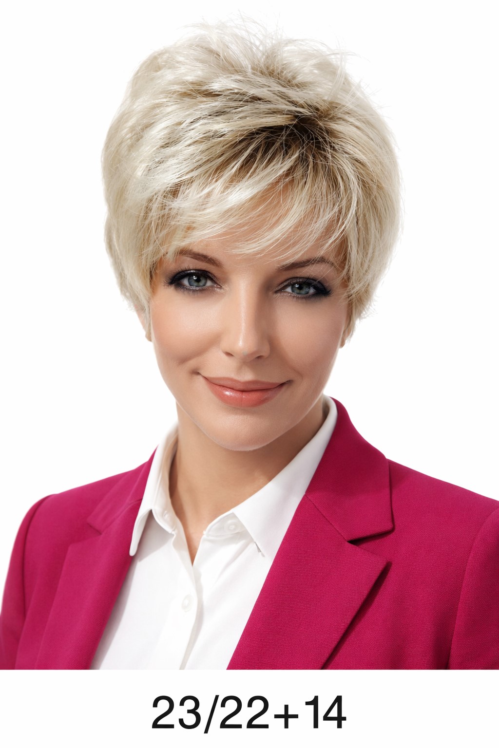 Krótka peruka z włosów syntetycznych przypominających prawdziwe włosy-Cosmo Lizzy Lace by Gisela Mayer zakończona koronką lace front.Włosy lekko uniesione do góry.Kolor – jasny blond szampański z efektem odrostu.odrostu.Rozmiar regulowany 54-56,5cm.Cert-CE