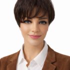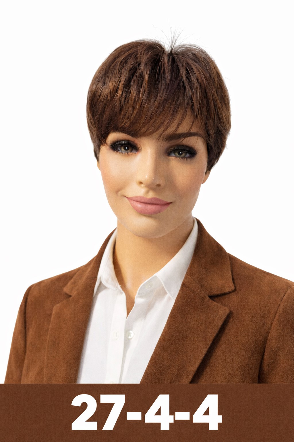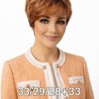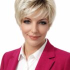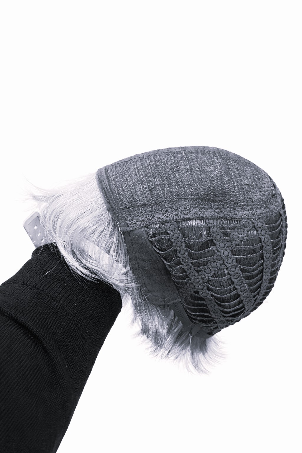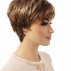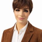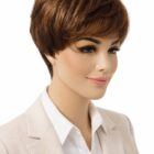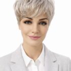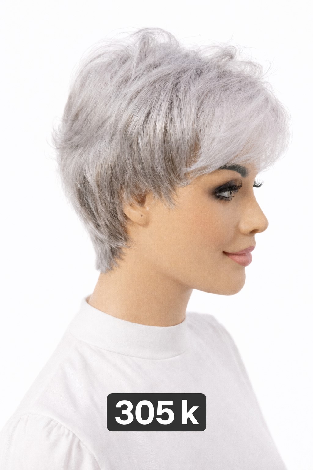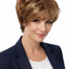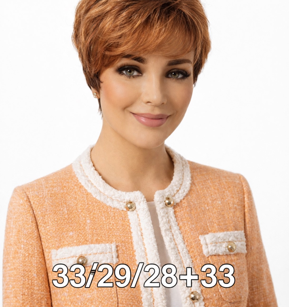 Krótka peruka z włosów syntetycznych przypominających prawdziwe włosy-Cosmo Lizzy Lace by Gisela Mayer zakończona koronką lace front.Włosy lekko uniesione do góry.Kolor – jasny blond szampański z efektem odrostu.odrostu.Rozmiar regulowany 54-56,5cm.Cert-CE