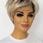 syntetyczna krótka peruka z grzywką .Wykonana w całości na tresach .Rozmiar regulowany 55,5cm-58 cm. Kolor jasny blond z efektem odrostu.